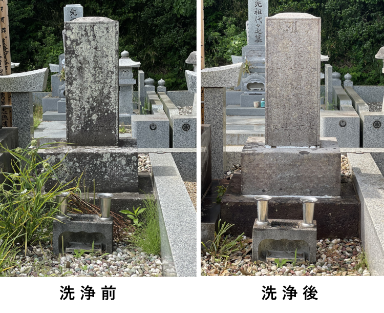 - 明治時代の墓石を、弊社コケ・カビ専用除去剤「ドンピカ・コケ」で洗浄したら、当初の風合いに戻り、隠れていた文字も鮮明になりました。